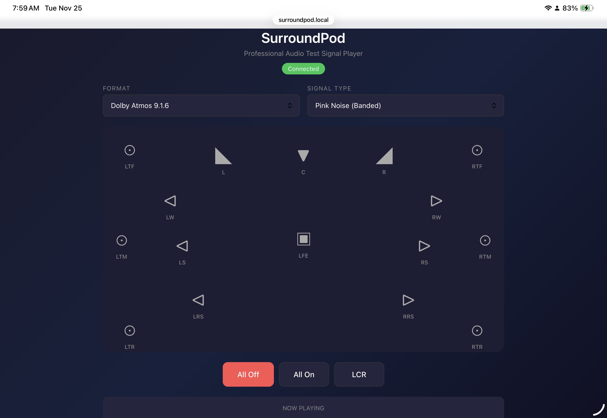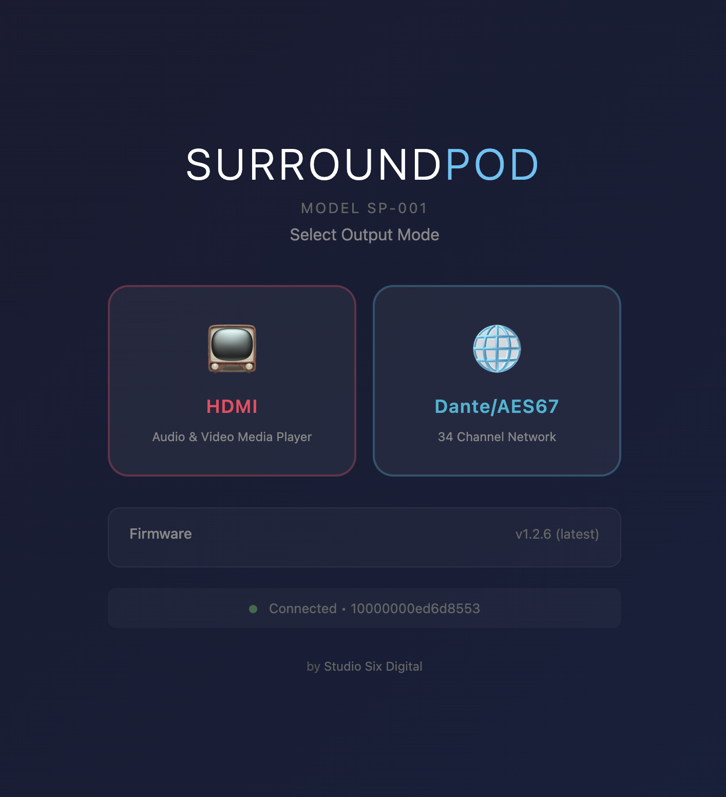SurroundPod is controlled over the network via a browser or one of our supported apps. The browser interface provides access to the Test Signal generator, Sine Generator, Music Player, and Video Player in HDMI mode, or Test Signals and the Sine Generator in AES67 mode.