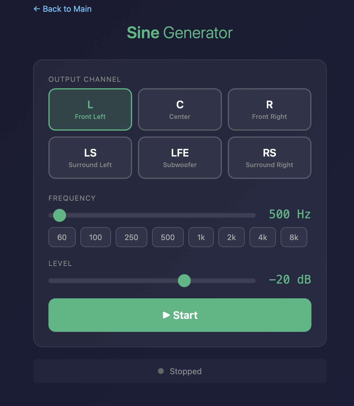 Generates sine waves from 10Hz–20kHz with smooth sweeping for rattle tests and subwoofer checks. Can be assigned to any 7.1 channel. Because sine waves are generated in real-time rather than played from a file, channel assignment is limited to 7.1.