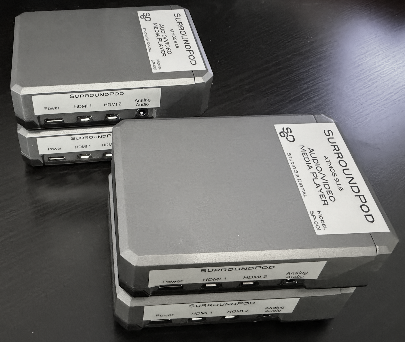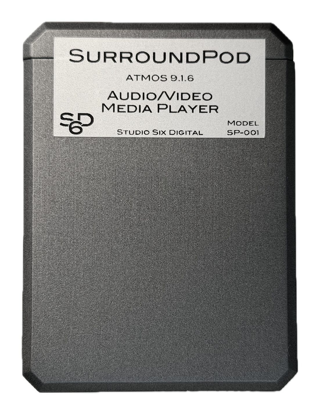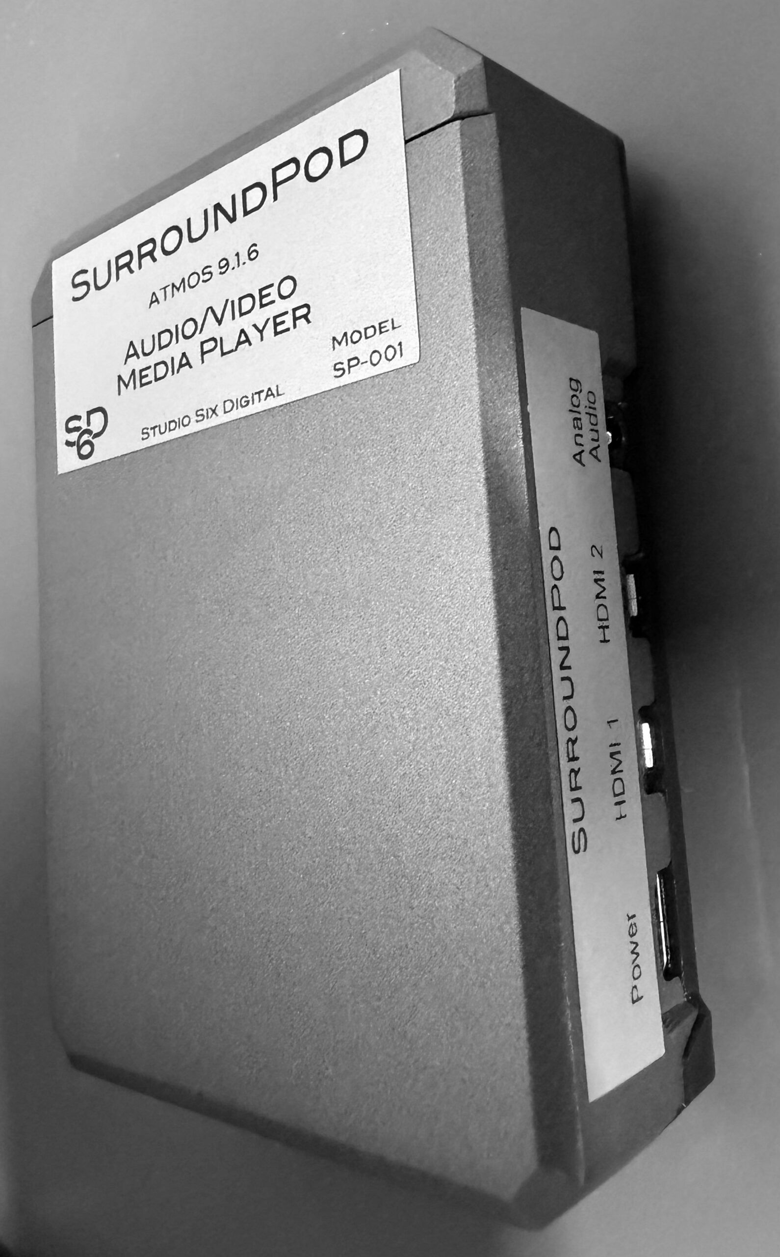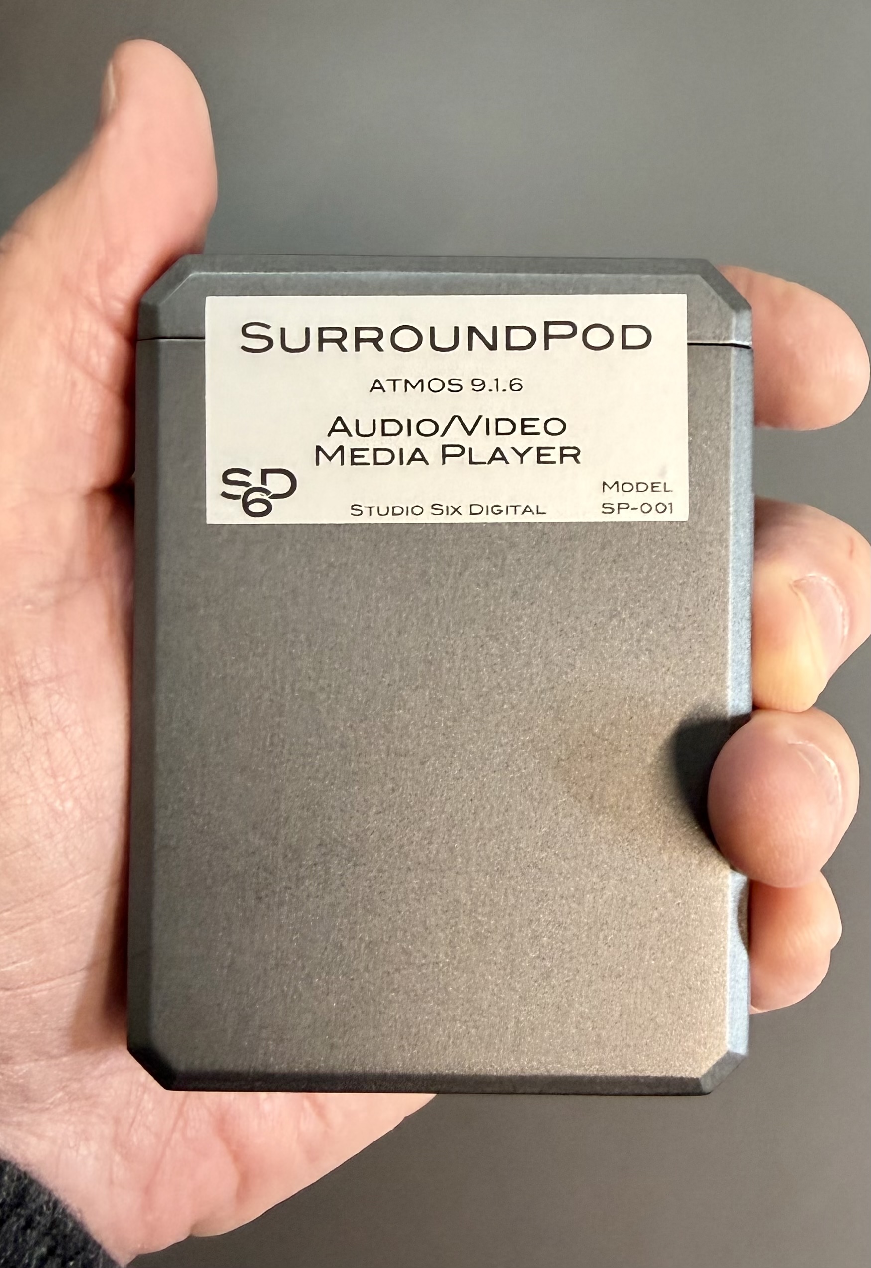 SurroundPod is a network-controlled surround sound signal generator, media player, and audio streaming device. Plug it into any A/V receiver or processor over HDMI to generate test signals in 5.1, 7.1.4, or 9.1.6 Dolby Atmos formats, play calibration audio and video files, generate sine waves, and stream AES67 audio over Ethernet.